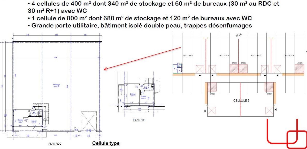 Bâtiment constitué de 4 cellules de 400 m² dont 340 m² de stockage et 60 m² de bureaux + 1 cellule de 800 m² dont 680 m² de stockage et 120 m² de bureaux sur un terrain de 7 398 m²
