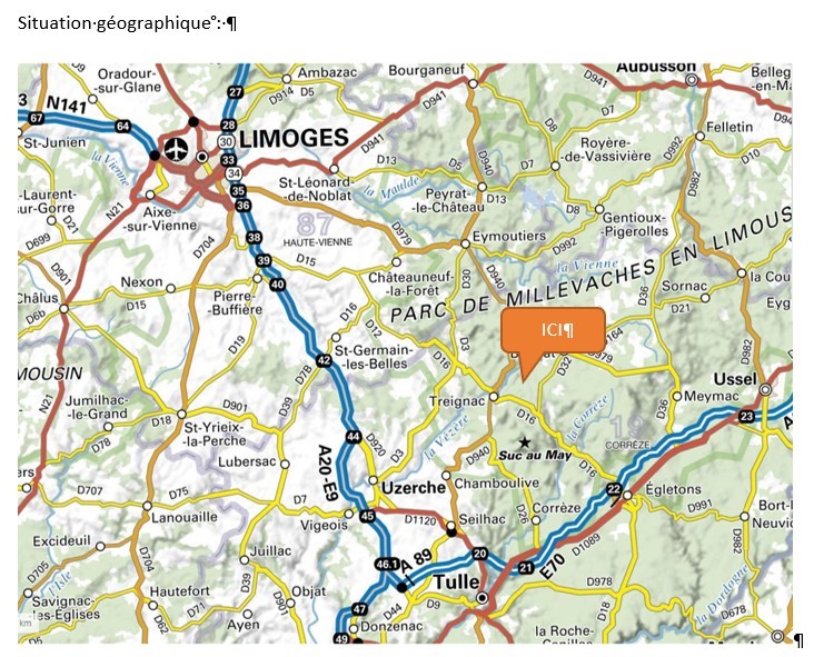 16 km de l'Autoroute A20 (66 km de Limoges) 45 km de Tulle par la D940
