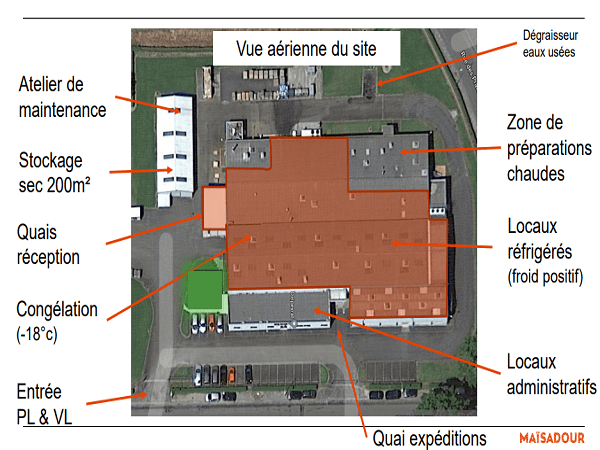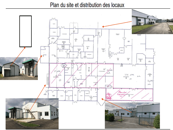La zone tertiaire est composée au rez-de-chaussée, d’un accueil, bureaux, locaux sociaux, sanitaires, infirmerie. Le bâtiment tertiaire communique avec les anciennes surfaces de production lesquelles sont divisées en multiples zones : la réception, les ateliers de préparation, les zones de stockage.
