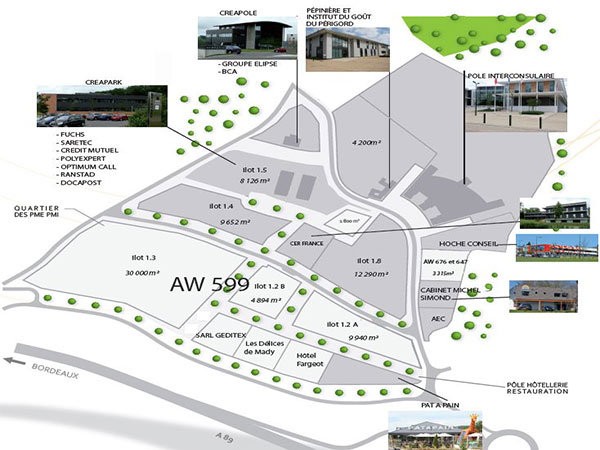 Terrains à partir de 1 800 m² sur une surface totale de 26 hectares sur un parc d'activité de haute qualité, pôles dominants : agroalimentaire, NTIC, entreprises innovantes. Une plateforme de services très haut débit (salle d’hébergement sécurisée, visioconférence), 14 000 m² de services aux entreprises : Pôle interconsulaire, Pépinière d’entreprises dédiée à l’agroalimentaire, aux NTIC, aux entreprises innovantes et aux éco-activités, Pôle d’excellence agroalimentaire avec l’Institut du Goût du Périgord et son laboratoire d’analyse sensorielle. Les aménagements inclus : voies piétonnes, signalétique, éclairage sur les espaces communs, électricité, téléphone, eau, gaz, assainissement, fibre optique, ADSL, ADSL+, parc paysager.