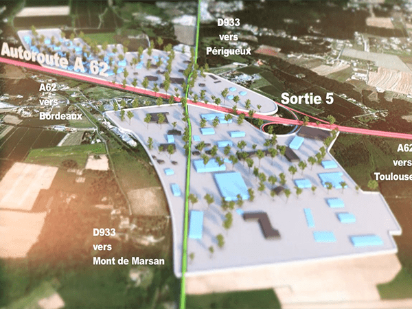 - Un emplacement stratégique auprès de l’échangeur autoroutier A 62 (Autoroute des Deux-Mers) et sur l’axe Bergerac – Mont-de-Marsan – Espagne,