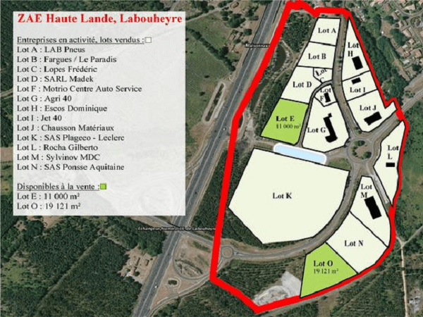 Située stratégiquement à la sortie de l'échangeur 16 de l'A64, la Zone d'Activité de la Haute Lande à Labouheyre (40) offre des terrains attrayants pour les investisseurs. C'est une localisation idéale pour les entreprises cherchant à profiter de l'accessibilité rapide et pratique aux voies de communication majeures. En investissant dans cette zone, vous bénéficiez d'un positionnement idéal à proximité immédiate de l'A64. Que vous envisagiez de créer une nouvelle activité ou de développer votre entreprise existante, nos terrains de la Zone d'Activité de la Haute Lande à Labouheyre sont l'endroit idéal pour vous. Située dans le département des Landes, Labouheyre est une commune dynamique offrant une qualité de vie exceptionnelle. L'implantation d'une entreprise dans cette zone d'activités offre une grande visibilité et un accès facilité grâce à sa proximité avec l'échangeur 16 de l'A64.Terrains disponibles à la Zone d'Activité de la Haute Lande à Labouheyre (40)