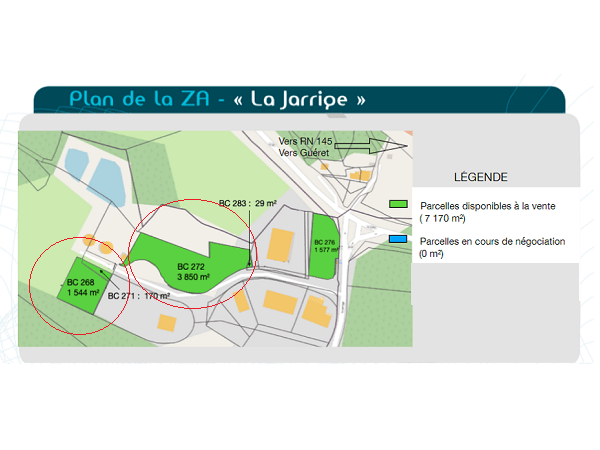 2 parcelles disponibles : N=° 272 : 3 850 m² N=° 276 : 1 577 m² Voirie de desserte interne adaptée à un trafic poids lourds et équipée de trottoirs avec plate-forme de retournement ; Plates-formes planes non terrassées ; Réseau d’eau potable ; Desserte incendie assurée sur la zone d’activités (pression assurée de 60 m3/heure pendant 2 heures) ; Desserte en électricité et gaz naturel ; Couverture téléphonie fixe, téléphonie mobile ; Accès au haut débit– Installation de la fibre optique prévue ; Éclairage public ; Aménagements paysagers.